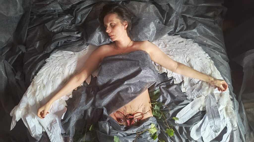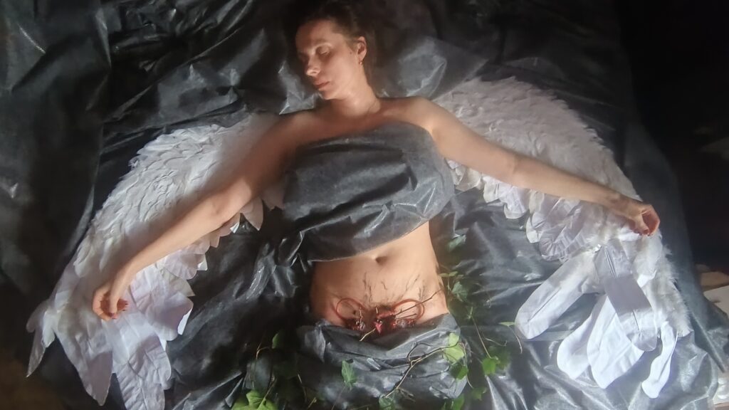 To brutalnie szczery obraz kobiety, którą zawłaszczył zabijający, z wędrującą zbyt krwawo macicą, ból.